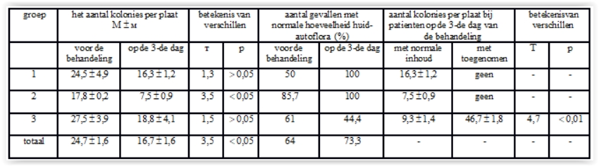 Wij hebben autoflora van de rechteronderarm bestudeerd, omdat aan de linkerkant de huidflora bij hartaandoeningen toeneemt. De indicatoren van deze methode hebben duidelijke grenzen van de norm: niet meer dan 20 kolonies op een afdruk van 12 cm2. Tab.3 geeft gegevens over de dynamiek van veranderingen in het aantal huid-autoflora vóór en tijdens behandeling met de Buteyko-methode. Significante verschillen werden verkregen in het aantal kolonies bij de onderzochte personen, wat een significante vermindering van microbiële besmetting van de huid aantoonde al in de vroege stadia van behandeling. Het gemiddelde aantal microben bij mensen met een normale indicator (in termen van het aantal huid-autoflora en het aantal kolonies per plaat) was 5 keer lager dan bij anderen.